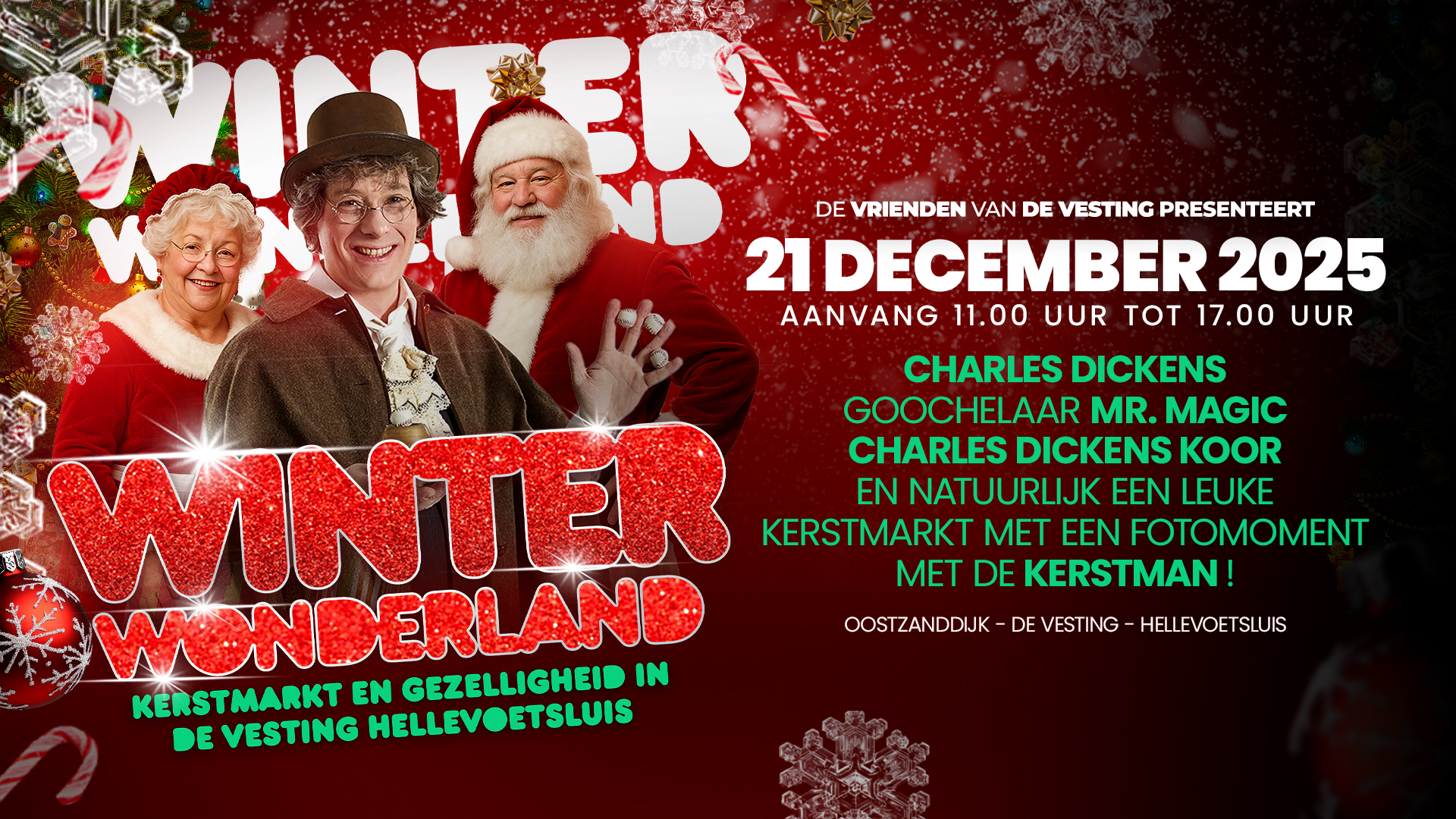- Op 21 december verandert de Vesting Hellevoetsluis in een sfeervol winterwonderland! Kom gezellig langs voor onze kerstmarkt vol warmte, lichtjes en heerlijke geuren. Laat je betoveren door het Charles Dickens koor, verwonder je over de trucs van onze goochelaar en maak een magische foto met de Kerstman bij ons leuke fotomoment! Breng familie en vrienden mee en geniet van de ultieme kerstsfeer in de mooiste vesting van Nederland. Vesting Hellevoetsluis Zaterdag 21 december - van 11.00 tot 17.00 uur. Mis het niet – gezelligheid gegarandeerd!